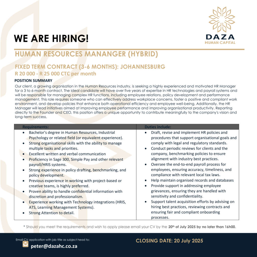 Should you meet the requirements and wish to apply please email your CV by the 20th of July 2025 by no later than 16h00.